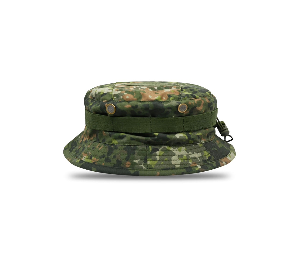 The overall design is the same as a standard bush hat, having features such as a neck cord , top ventilation windows and loops around it to aid camouflage and concealment, however on this hat the brim is shortened. This improves the field of vision of the wearer and is one of the reasons why this type of hat has been adopted by the special-forces.